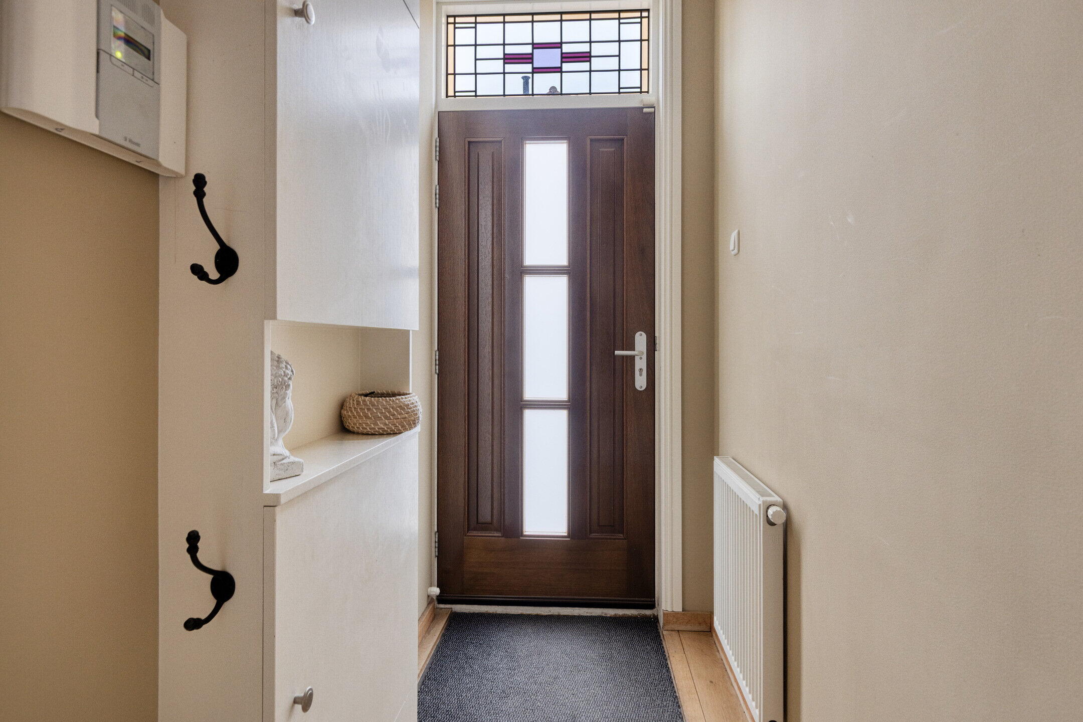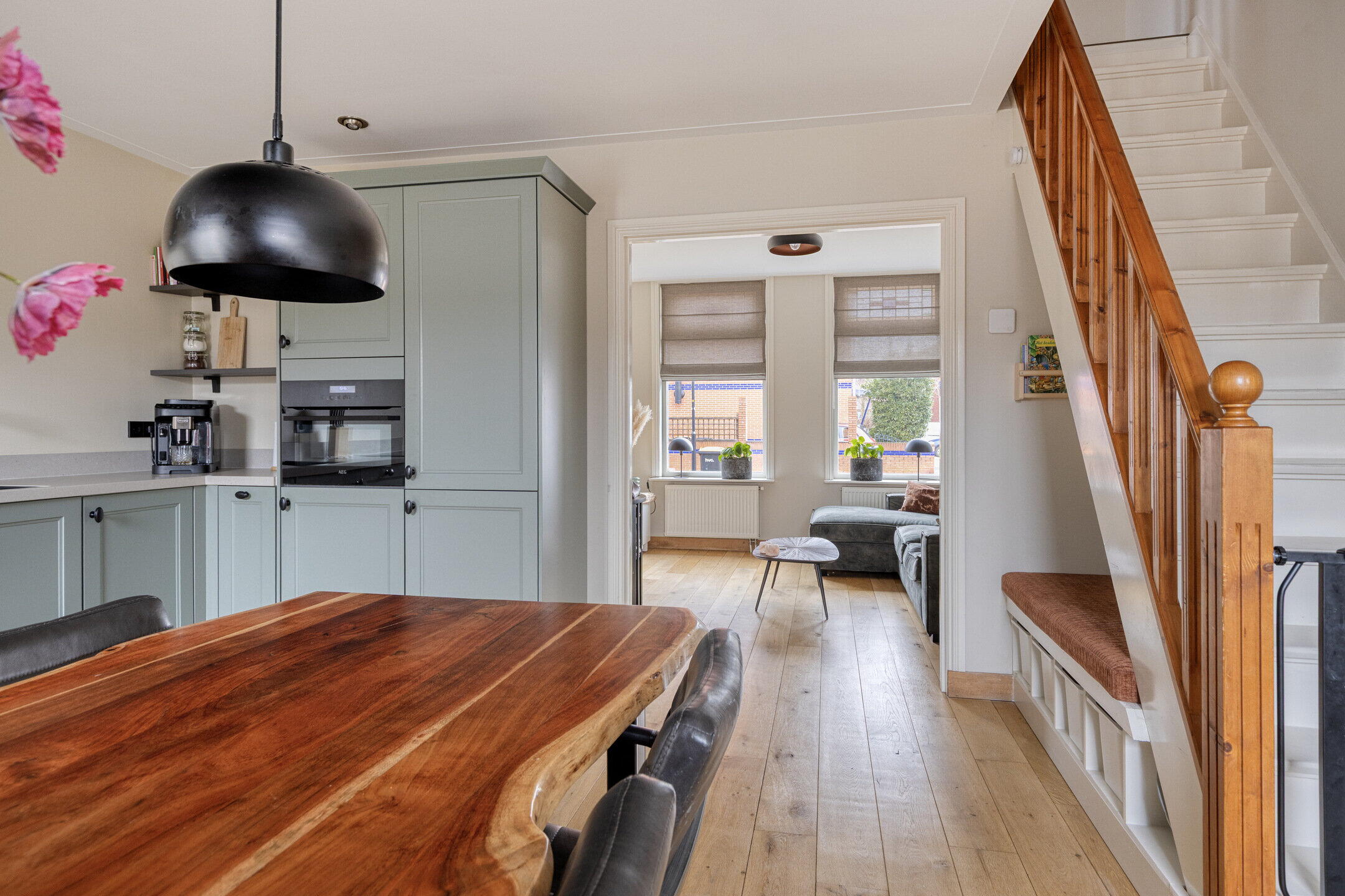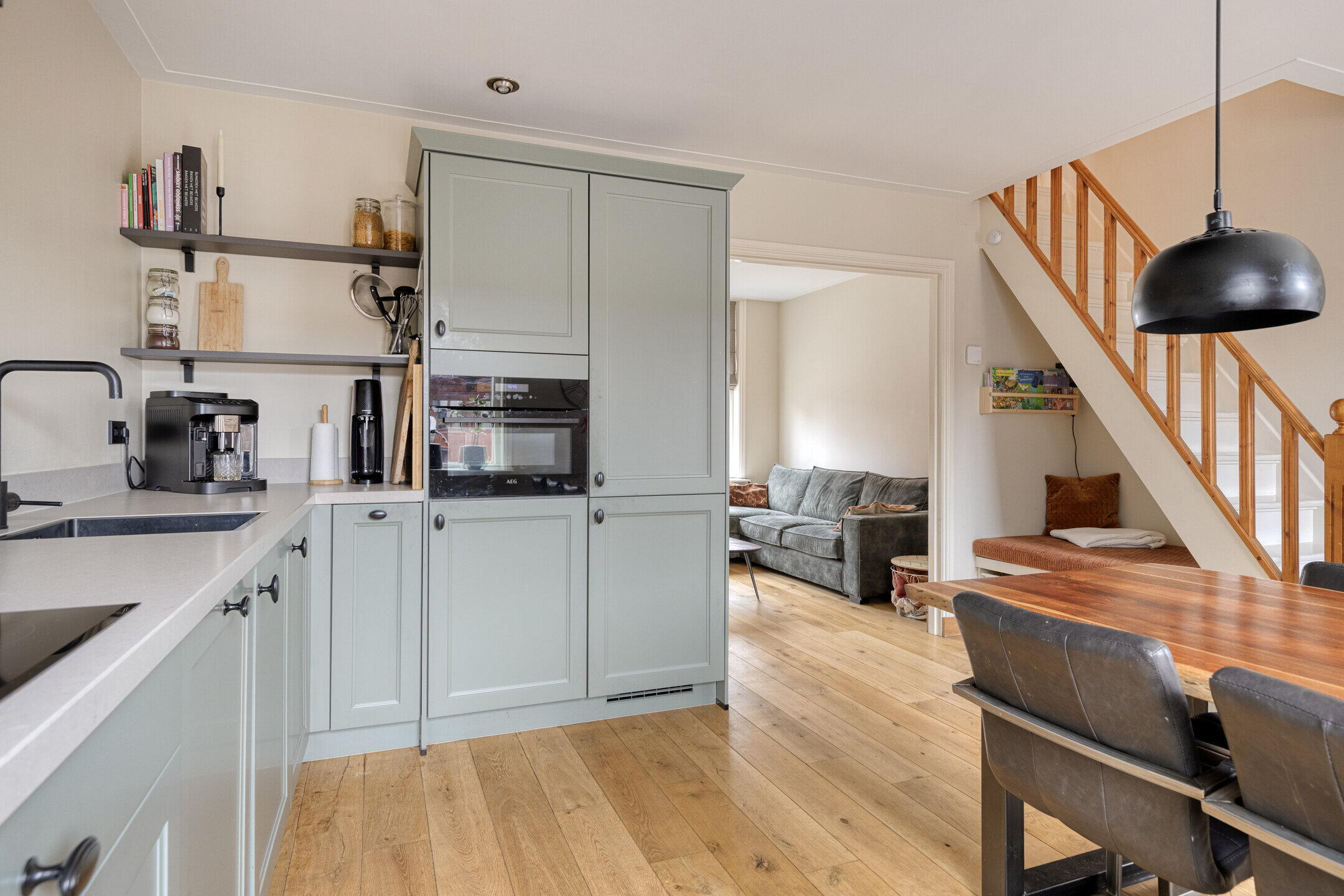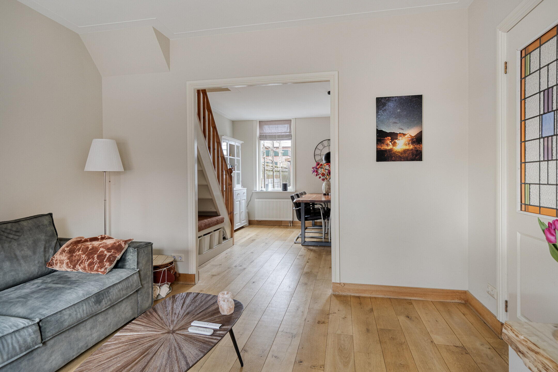 Entree met meterkast en vaste kast. Vanuit de hal toegang tot de lichte woonkamer met zitgedeelte aan de voorzijde en eetgedeelte aan de achterzijde. In het eetgedeelte bevindt zich de trapopgang. De open keuken met divers inbouwapparatuur ligt aan de achterzijde en biedt toegang tot de gang met toilet en deur naar de achtertuin met houten berging/schuur.